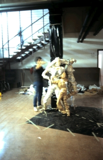Acción coral. Espacio: micro para solista de acordeón de juguete. Batería electrónica con samplers de voz de Gloria Fuertes. Caballete y bastidor para pintura a ciegas.